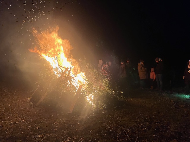 We toasted the trees at the playing field before processing, with banging of pans, to Stone Common to toast the trees there. We ended the event with a celebratory bonfire, mulled cider, sausage rolls and apple flapjacks.